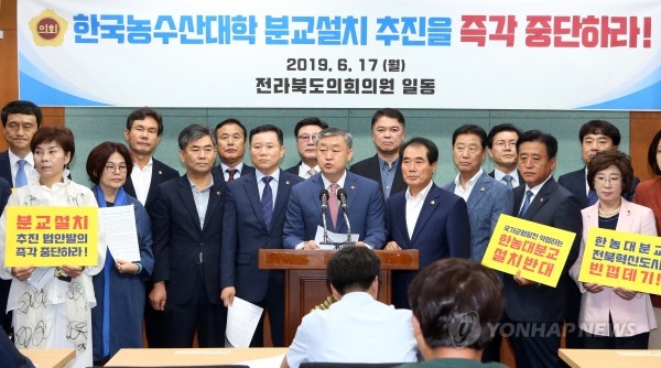 전북도의회 의원들이 지난 17일 도의회 청사에서 국립한국농수산대학(한농대) 분교 설치 법안 철회를 촉구하고 있다.