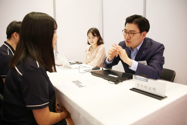 19일 이정훈 서울 강동구청장이 오후 2시 강동아트센터 대극장에서 개최된 ‘2020학년도 One-Stop 진로진학 박람회’에 참석해 학생과의 1대1 전공 상담을 통해 본인의 전공 및 진로선택의 경험을 학생과 공유하는 의미 있는 시간을 보냈다. 사진은 진로 상담을 하고 있는 이 구청장의 모습. (사진제공=강동구청)