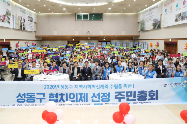 서울 성동구는 최근 구청 3층 대강당에서 주민들과 공무원이 참석한 가운데 오는 2020년 지역사회혁신계획 의제 선정을 위한 ‘협치의제 선정 주민총회’를 개최했다. 사진은 이날 주민총회에서 정원오 구청장과 주민들이 기념촬영을 하는 모습. (사진제공=성동구청)