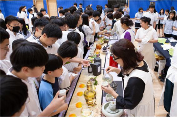 전남 나주시는 최근 금천중학교에서 학생들의 열띤 참여와 호응 속에 인문학콘서트 ‘흥겨운 나주 소리 판’을 개최했다. 이날 흥부가 박타령 장단 및 판소리 배우기, 전통차 체험 등이 진행됐다. 사진은 학생들이 전통차를 시음해보는 모습. (사진제공=나주시청)
