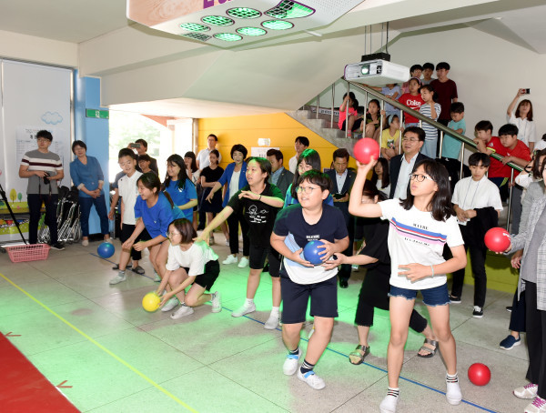 서울 노원구는 최근 월계초등학교에서 오승록 구청장과 학생 등이 참여한 가운데 ‘VR스포츠시설 개장 행사’를 개최했다. 이날 시설 관람, 체험행사 등이 진행됐다. 사진은 이날 행사에 참여한 학생들이 VR 체험을 하고 있는 모습. (사진제공=노원구청)
