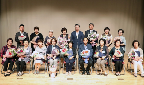서울 용산구가 지난 19일 용산아트홀 소극장에서 '2019 통장 역량강화 교육'을 개최했다. 이날 행사는 성장현 구청장을 비롯해 지역내 통장 330여명이 참석한 가운데 진행됐다. 사진은 성 구청장과 모범통장 표창 수상자들의 기념촬영 모습. (사진제공=용산구청)