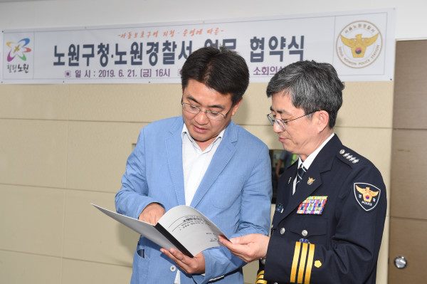 서울 노원구는 최근 구청 소회의실에서 ‘노원구청-노원경찰서 간 아동보호구역 지정 협약’을 체결했다. 협약에 따라 구는 아동보호구역 지정 등을 하게 된다. 사진은 협약 체결 후 오승록 구청장(왼쪽)과 노원경찰서장이 협약서를 낭독하는 모습. (사진제공=노원구청)