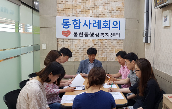경기 동두천시 불현동은 최근 복지 상담실에서 지역내 복지사각지대 지원을 위한 내부사례회의를 열었다. 이날 회의에서는 담당부서 직원들이 복지사각지대 발굴조사를 통해 복지서비스 지원이 필요한 5가구를 대상자로 선정했다. 사진은 회의 진행 모습. (사진제공=동두천시청)