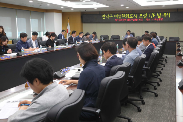 서울 관악구가 24일 구청 기획상황실에서 '관악구 여성친화도시 TF팀 발대식 및 사업보고회'를 열었다. 이날 행사는 그간 여성친화도시 추진현황 보고와 함께 관련 부서장들의 사업계획보고, 자유토론 등이 진행됐다. 사진은 회의 진행 모습. (사진제공=관악구청)