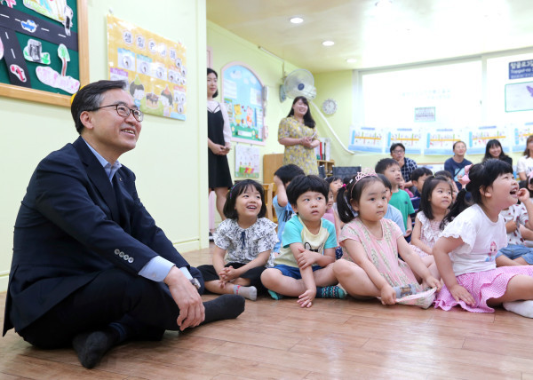서울 금천구가 24일 시흥5동 백상유치원에서 ‘금천 꿈나무 도시공간 체험교실 수료식’을 개최했다. 사진은 도시공간 체험교실의 마지막 학습인 '사뿐사뿐 콩콩' 층간소음 예방교실에 참여한 유성훈 구청장이 아이들과 함께 수업을 들으며 즐거워하고 있는 모습. (사진제공=금천구청)