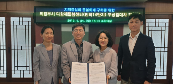 경기 의정부시는 24일 시청 소회의실에서 LH한국토지주택공사 서울지역본부와 민락14단지내 다함께돌봄센터를 무상임대하는 업무협약을 체결하며 센터 설치와 운영에 상호협력하기로 했다. 사진은 협약 체결 후 기념촬영을 하는 모습. (사진제공=의정부시청)