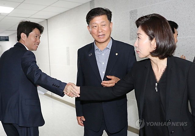 자유한국당 나경원 원내대표(오른쪽)와 더불어민주당 이인영 원내대표가 25일 오후 국회 의원회관 복도에서 조우, 악수를 나누고 있다.