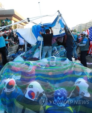 25일 오전 서울 종로구 광화문 광장에서 농성 중이던 대한애국당(우리공화당) 천막을 서울시와 용역업체 관계자들이 당원들의 저항 속에 철거하고 있다.