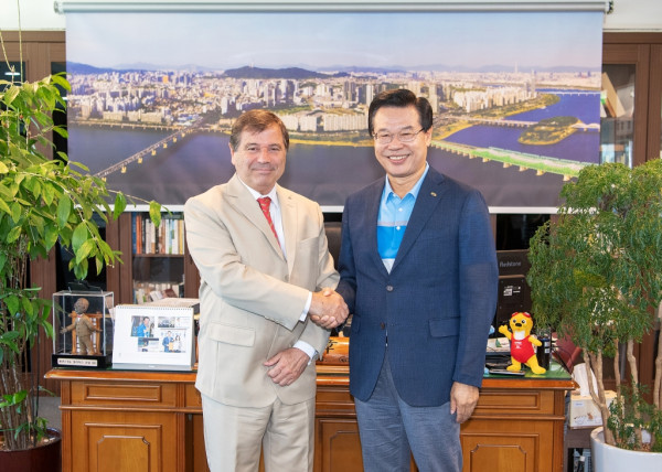 성장현 서울 용산구청장이 25일 구청 집무실에서 알프레도 까를로스 바스꼬우 주한 아르헨티나 신임대사를 만나 양국 교류 활성화 방안을 논의했다. 사진은 성 구청장(오른쪽)과 아르헨티나 신임 대사의 기념촬영 모습. (사진제공=용산구청)
