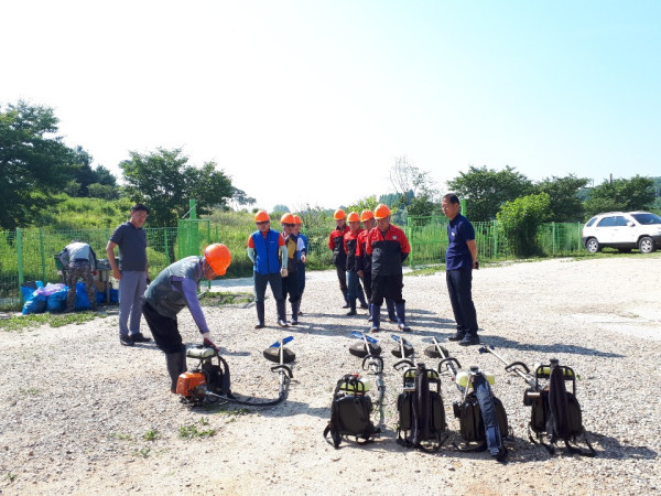 경기 여주시는 지난 25일 연양동 산불진화대기소 현장에서 지역내 임도관리원과 산불진화대원, 산림보호팀 직원 등 10여명이 참여한 가운데 임도변 제초작업에 필수인 예초기 안전작동법과 취급관리, 보관방법 등의 안전관리 교육을 실시했다. 사진은 교육 모습. (사진제공=여주시청)