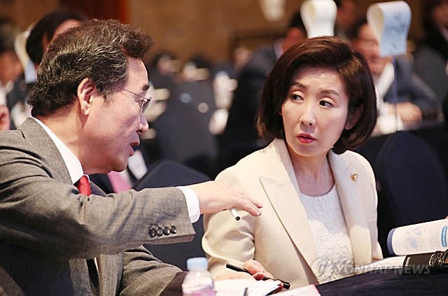 이낙연 국무총리가 자유한국당 나경원 원내대표와 27일 서울 중구 롯데호텔에서 연합뉴스와 통일부 공동 주최로 열린 제5회 한반도평화 심포지엄 ‘상생·공영의 신한반도체제’ 오찬 행사에서 대화하고 있다.