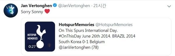 베르통언은 27일(한국시각) 자신의 SNS를 통해 "Sorry Sonny"라는 문구와 함께 영상을 업로드했다. 영상 속 내용은 베르통언이 벨기에 대표팀 유니폼을 입은 채 대한민국의 골망을 흔들며 기뻐하는 모습을 하고 있다.