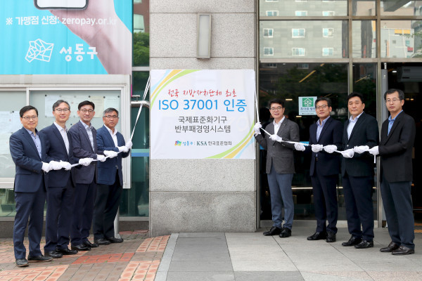 성동구는 1일 구청 정문에서 반부패경영시스템(ISO 37001) 현판 제막식을 개최했다. 이날 개막식에는 정원오 구청장과 구 간부직원들이 참석해 함께 현판을 제막했다. 사진은 정 구청장(오른쪽 네 번째)과 간부들이 현판을 제막하는 모습. (사진제공=성동구청)