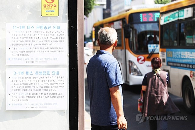 1일 오후 경기도 안양시의 한 버스정류장에 주 52시간 단축 근로 시행에 따른 노선 폐지 안내문이 붙어 있다. 300인 이상 버스사업장의 주 52시간 단축 근로가 시행된 1일 경기 지역에서는 인력 부족 등을 이유로 김포, 안양, 여주 등 3개 시만 노선 조정이 이뤄지는 등 큰 혼란은 없는 것으로 파악됐다.