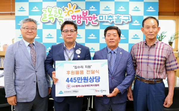 인천 미추홀구는 최근 (사)행복나눔장애인복지협회로부터 장애인 가구 집수리를 위한 445만원 상당의 물품을 후원받았다. 이날 전달된 물품은 (사)학산나눔재단을 통해 장애인 가구에 전달될 예정이다. 사진은 기념촬영을 하는 모습. (사진제공=미추홀구청)