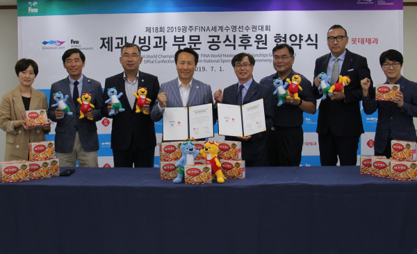롯데제과와 ‘2019 광주세계수영선수권대회’ 조직위원회는 지난 1일 오후 2시 광주 조직위원회 회의실에서 대회의 공식 후원 협약을 체결했다.