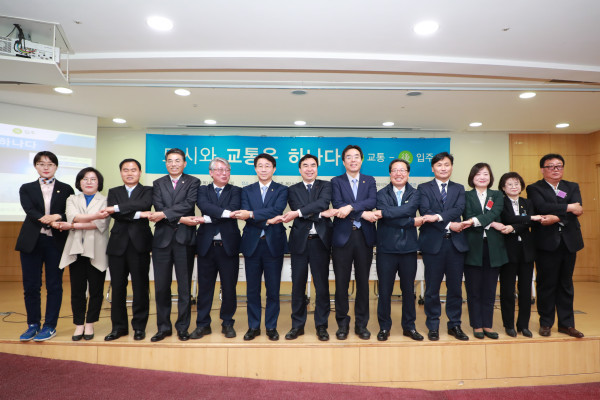 | ▲ 지난 5월2일 열린 '도시와교통은 하나다' 세미나를 마친 후 조광한 시장(오른쪽 다섯 번째)이 참석자들과 함께 손을 잡고 기념촬영을 하고 있다. (사진제공=남양주시청) | ||