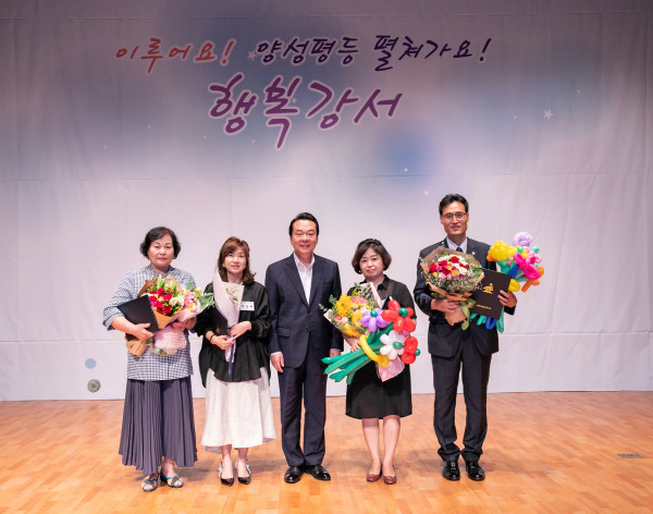 노현송 서울 강서구청장이 3일 강서구민회관에서 열린 ‘양성평등주간 기념식’에 참석해 여성권익향상 및 양성평등 발전에 기여한 유공자에게 표창장을 수여하고 격려했다. 사진은 노 구청장(가운데)과 유공자들이 기념촬영을 하는 모습. (사진제공=강서구청)