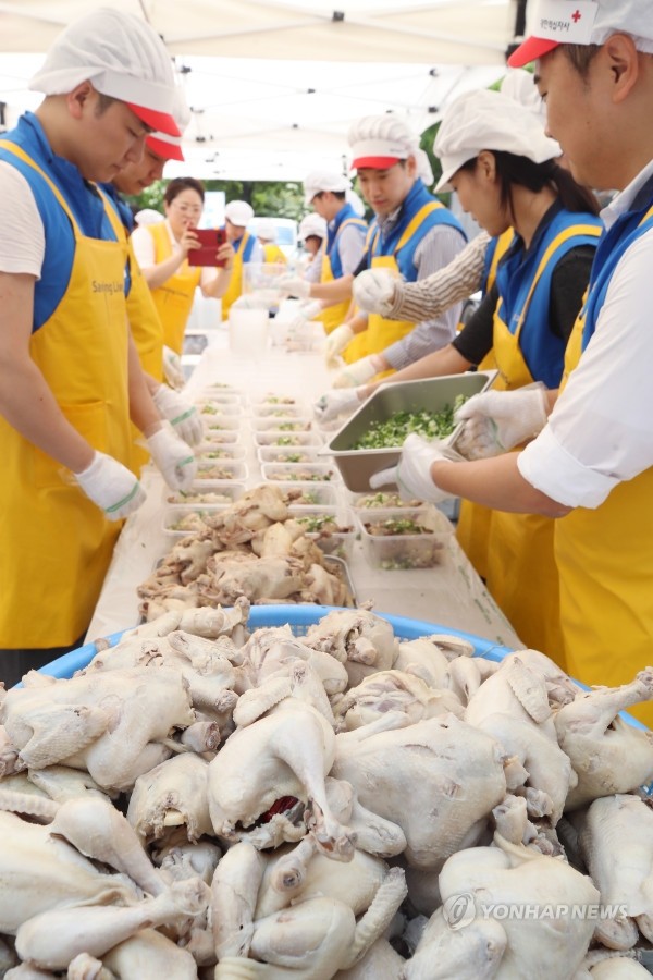 4일 오전 서울 노원구 대한적십자 서울지사 북부봉사관에서 열린 '고려아연과 함께하는 어르신 건강한 여름나기' 봉사활동에서 직원과 봉사자들이 직접 만든 삼계탕을 포장하고 있다.