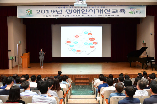 서울 중랑구는 3일 구청에서 사회복무요원 등을 포함한 전직원 1600여명을 대상으로 총 2회에 걸쳐 '장애 인식개선 교육'을 실시했다. 사진은 강사가 장애의 정의 및 장애유형, 직장내 장애인의 인권 등의 관련 법·제도 등에 관한 강의를 하는 모습. (사진제공=중랑구청)