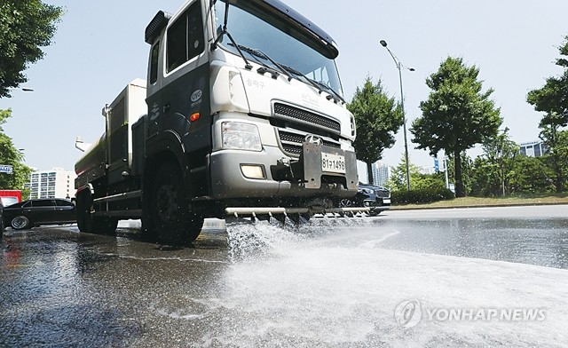 서울을 비롯한 중부지방에 폭염주의보가 내려진 4일 서울 송파구 거리에서 살수차가 물을 뿌리며 도로의 온도를 낮추고 있다. 다가오는 주말에는 서울의 낮 기온이 34도까지 오르는 등 올 들어 가장 더운 날씨가 전망된다.