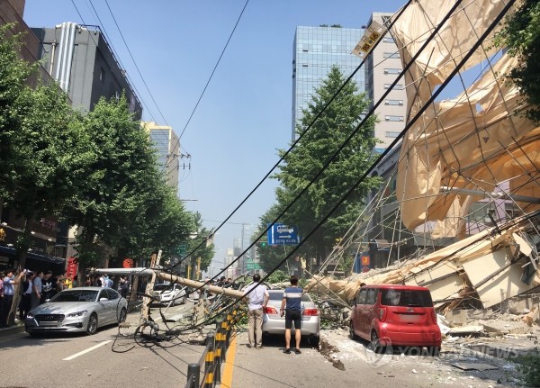 4일 오후 2시 23분께 서울 서초구 잠원동에서 철거 작업 중인 건물이 붕괴해 지지대와 인근 전신주 등이 차도를 덮고 있다.
