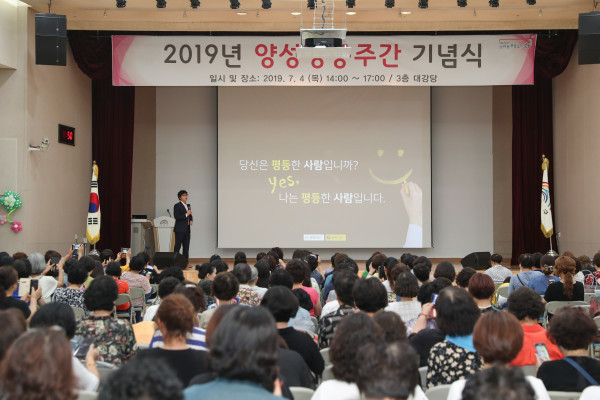 서울 성동구는 최근 양성평등주간을 맞아 구청 3층 대강당에서 ‘양성평등주간 기념행사’를 개최했다. 이날 양성평등의 진정한 실현을 주제로 공연과 강의가 어우러진 '팝페라 양성평등 콘서트'도 열렸다. 사진은 강연이 진행되고 있는 모습. (사진제공=성동구청)