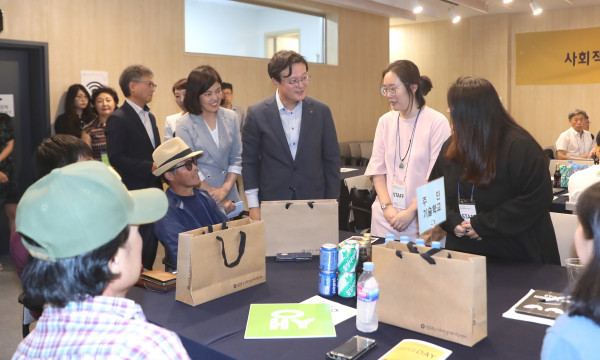서울 영등포구가 최근 하우징랩에서 사회적 경제에 대한 이해도를 높이고 정보를 교류하기 위한 ‘사회적 경제 네트워킹 데이’를 개최했다. 사진은 이날 행사에 참석한 채현일 구청장(오른쪽에서 세 번째)이 구민들과 인사를 나누는 모습. (사진제공=영등포구청)