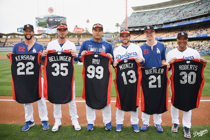 그는 데이브 로버츠 감독, 클레이턴 커쇼, 코디 벨린저, 맥스 먼시, 워커 뷸러와 나란히 서 등 번호 99번이 새겨진 유니폼을 들고 미소를 지었다.