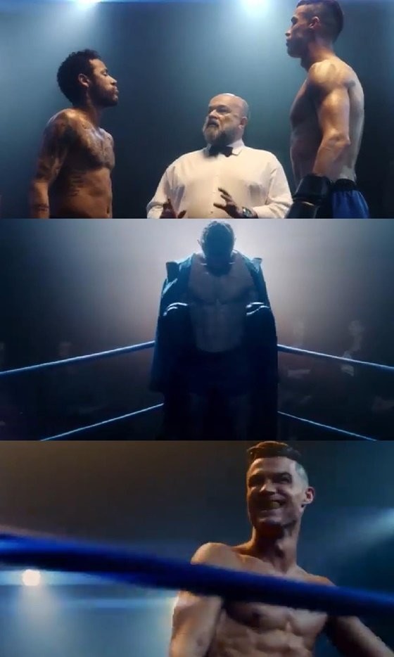 광고서 호날두와 네이마르는 링 위에 올라 신경전을 벌였다. 특히 네이마르는 자신의 축구 개인기처럼 화려한 스탭을 밟은 뒤 호날두를 향해 잽을 날렸다.