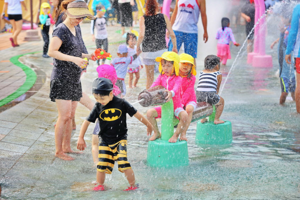 금천구는 지난 6일 오후 1시 안양천 둔치(금천교 부근)에 위치한 ’금천 퐁당퐁당 어린이물놀이장’에서 개장 행사를 가졌다. 사진은 어린이물놀이장에서 아이들이 신나는 물놀이를 즐기고 있는 모습. (사진제공=금천구청)