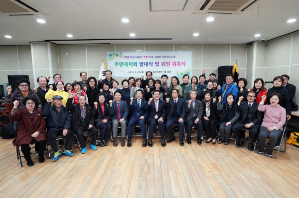 | ▲ 지난 2월25일 이문1동 주민자치회 발대식에서 주민자치회 위원·유덕열 구청장이 기념촬영을 하고 있다. (사진제공=동대문구청) | ||