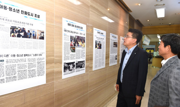 오승록 서울 노원구청장이 8일 구청 1~2층 로비에서 열린 언론보도 기획전 ‘노원구 민선7기 1년간의 발자취’에 참석했다. 기획전에는 지난 1년간 언론에서 다룬 주요 기사들이 전시됐다. 사진은 오 구청장(왼쪽)이 기사를 보고 있는 모습. (사진제공=노원구청)