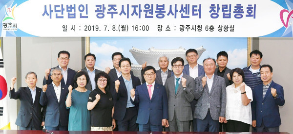 경기 광주시는 8일 자원봉사센터 법인설립을 위한 창립총회를 개최했다. 이날 총회는 2019년 사업계획 및 예산 승인 등으로 진행됐다. 사진은 총회에 참석한 신동헌 시장(앞줄 오른쪽에서 다섯 번째)과 관계자들이 기념촬영을 하는 모습. (사진제공=광주시청)