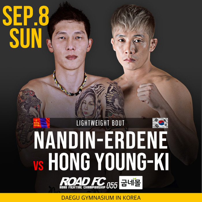 난딘에르덴과 홍영기는 9월 8일 대구체육관에서 열리는 굽네몰 로드FC 055에서 맞대결한다. 몽골 복싱 국가대표 출신의 난딘에르덴은 복싱 베이스의 날카롭고 파괴력 넘치는 펀치가 주특기다.