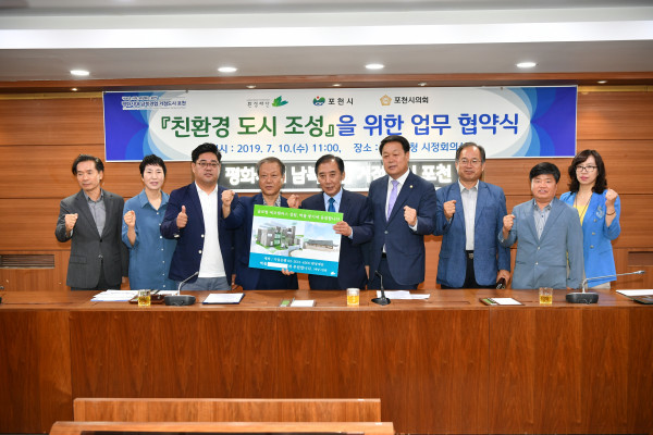 경기 포천시는 포천시의회 및 환경재단과 10일 친환경 도시 조성을 위한 업무 협약을 체결했다. 각 기관은 지역사회와 연계한 그린환경 운동 전개 등에 힘쓸 것을 약속했다. 사진은 박윤국 시장(가운데)과 관계자들이 기념촬영을 하는 모습. (사진제공=포천시청)
