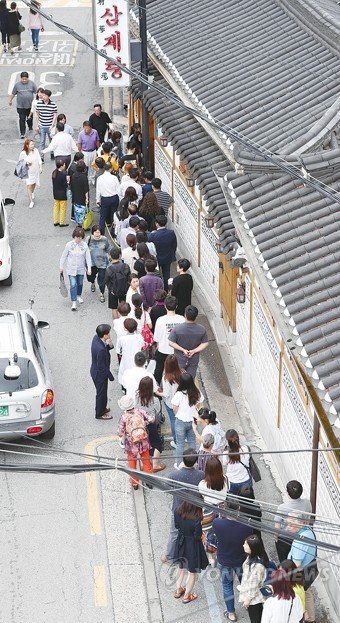 초복을 하루 앞둔 11일 서울 종로구의 한 삼계탕 전문점 앞에 손님들이 줄지어 서 있다.