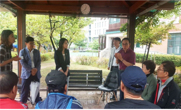 최근 정미옥 서울 강동구의회 건설재정부위원장이 성내하니근린공원의 정비사업에 앞서 개최된 현장설명회에 참석해 주민들의 요구사항과 추진사업에 반영할 의견을 들었다. 사진은 설명회에서 정비사업에 대한 설명을 듣고 있는 정 의원과 주민들의 모습.(사진제공=강동구의회)