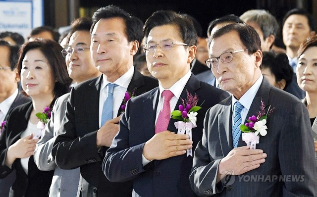 더불어민주당 이해찬(오른쪽 부터), 자유한국당 황교안, 바른미래당 손학규, 민주평화당 정동영, 정의당 심상정 대표가 17일 오전 국회에서 열린 제71주년 제헌절 기념식에서 국기에 경례하고 있다.