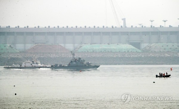 합동참모본부는 17일 아침 충남 당진 서해안고속도로 행담도 휴게소 인근 해상에서 잠수함의 잠망경 추정 물체를 봤다는 신고가 접수돼 현재 정밀 확인하고 있다고 밝혔다. 사진은 17일 오전 해군 · 해경 함정들이 행담도 휴게소 앞 해상을 수색하는 모습.