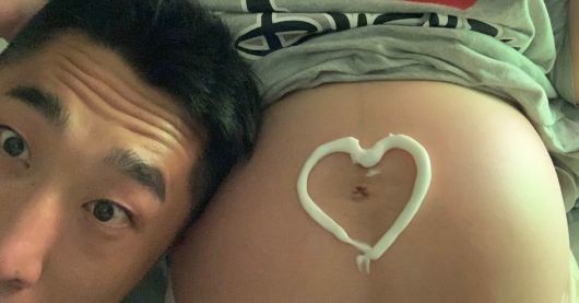 사진 속 김동현은 튼살 크림을 하트 모양으로 바른 아내의 부푼 배 옆에 얼굴을 붙이고 있는 모습이었다.