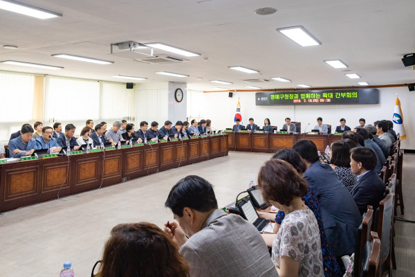 서울 광진구가 18일 구청 기획상황실에서 명예 구청장과 함께하는 확대간부회의를 개최했다. 이날 김선갑 구청장을 비롯해 중곡1동, 능동, 구의3동 등 13명의 명예 구청장이 참석한 가운데 주요현안 보고를 함께 듣는 소통행정의 시간을 보냈다. 사진은 김 구청장이 명예구청장들과 확대간부회의를 진행하는 모습. (사진제공=광진구청)