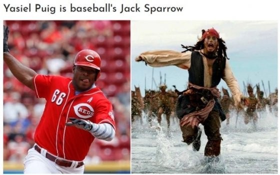 더욱 재미있는 사실은 이러한 푸이그와 닮은 사람을 찾았다는 것이다. 그는 바로 영화 '캐리비안 해적'의 선장 잭 스패로우다. 한 트위터의 제보로 전해졌다. 특히 이들은 허풍을 떠는 모습이 묘하게 닮았다.