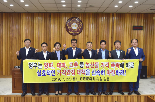 | ▲ 영광군의회가 22일 제242회 임시회 제4차 본회의를 열고 상정안건을 의결했다. 사진은 상정안건 가운데 '양파·대파·고추 가격안정대책 수립 촉구 건의문'을 채택한 뒤 군의원들이 플래카드를 들고 신속한 대책 마련을 촉구하는 모습. (사진제공=영광군의회) | ||