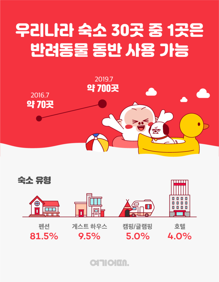 여기어때에 따르면 올여름 반려동물 동반 여행 가능 숙소는 700여 곳으로, 3년 전보다 10배 늘었다. 2016년에는 70여 곳에 불과했다. 실시간 예약 가능한 여기어때의 국내 제휴 숙박시설 데이터를 토대로 집계한 결과다. '반려동물 인구 1,000만 시대'로 불릴 만큼 개, 고양이 등을 키우는 펫팸족 가구가 크게 늘면서 수요를 노린 많은 숙박시설이 용도를 확장, 변경한 것에 따른 것으로 보인다.
