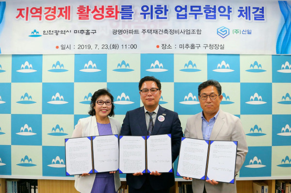 인천 미추홀구는 23일 광명아파트 주택재건축정비사업조합 및 주식회사 신일과 함께 지역 경제 활성화를 위한 업무협약을 체결했다. 이번 협약에 따라 건설에 따른 지역 업체 참여 확대 등에 힘쓰게 된다. 사진은 기념촬영을 하는 모습. (사진제공=미추홀구청)