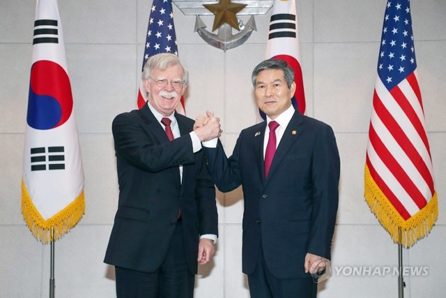 정경두 국방부 장관이 24일 서울 용산구 국방부를 방문한 존 볼턴 미국 백악관 국가안보회의 보좌관과 접견에 앞서 기념촬영을 하고 있다.
