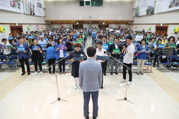 서울 성동구는 25일 구청 3층 대강당에서 찾아가는 동네이웃 ‘시민찾동이 발대식’을 개최했다. 이들은 이웃의 불편사항 등에 대해 알리는 역할을 하게 된다. 사진은 발대식에서 시민찾동이 대표 2명이 활동선언문 낭독을 하는 모습. (사진제공=성동구청)
