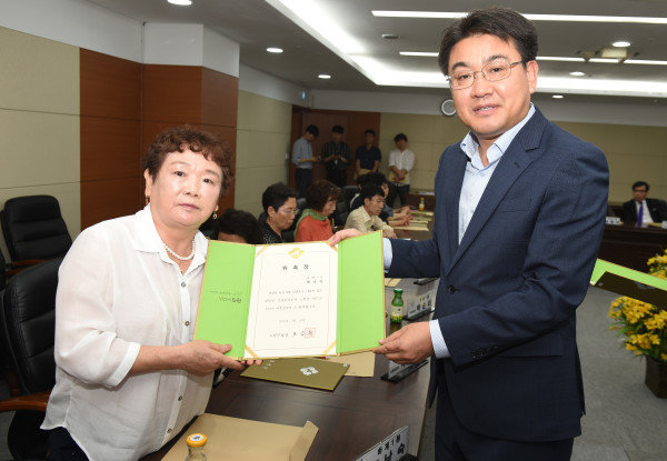 서울 노원구는 25일 구청 기획상황실에서 ‘이웃살피미 위촉장 수여식’을 개최했다. 이웃살피미로 위촉된 주민들은 고독사 위험 가구를 방문해 안부를 확인하는 활동을 하게 된다. 사진은 오승록 구청장(오른쪽)과 이웃살피미가 기념촬영을 하는 모습. (사진제공=노원구청)